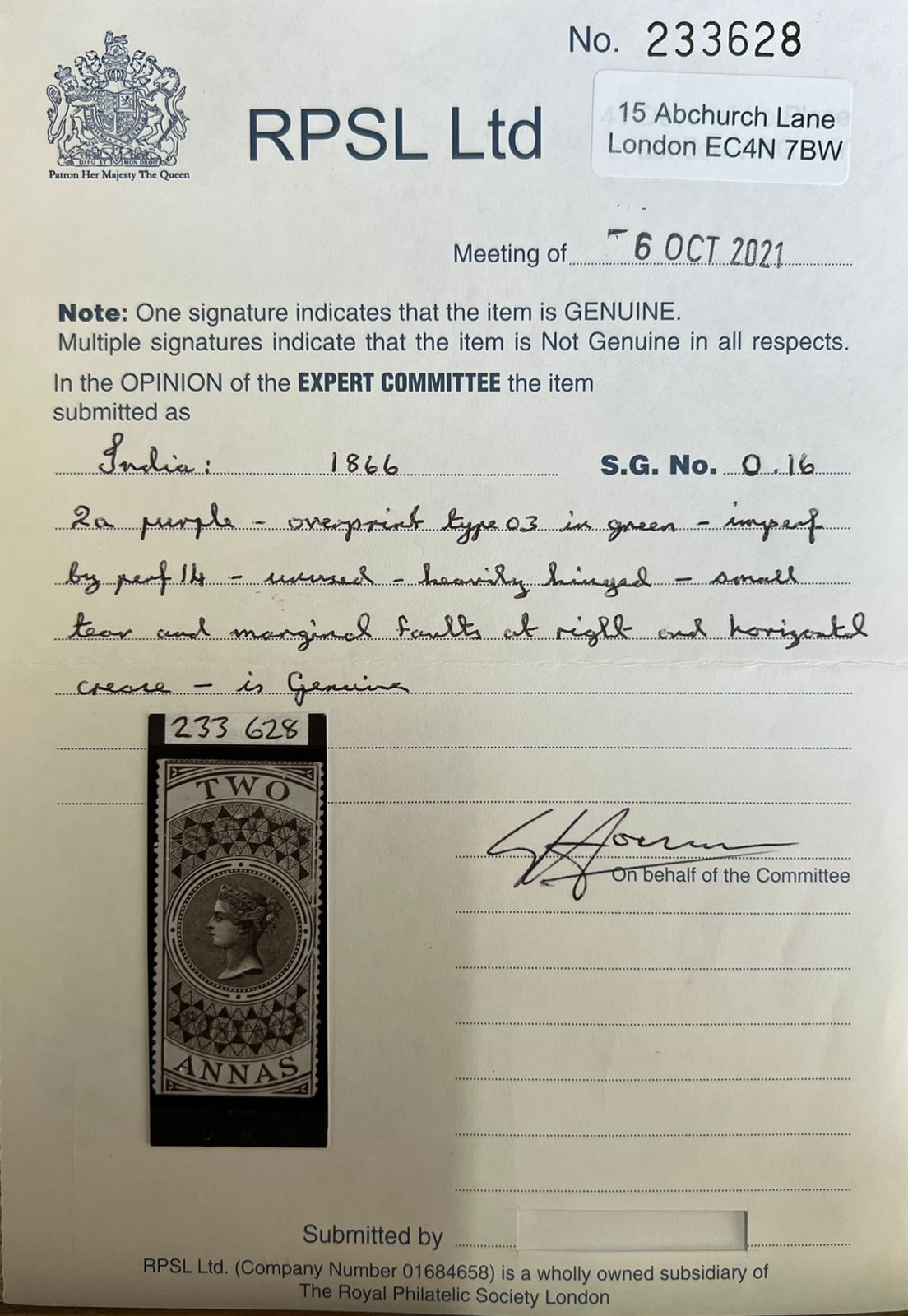 India 1866 QV SG O16 Two Annas SERVICE POSTAGE Overprint Mint RPS Cert Rare SG Val £3500