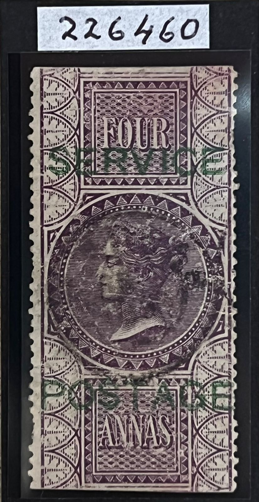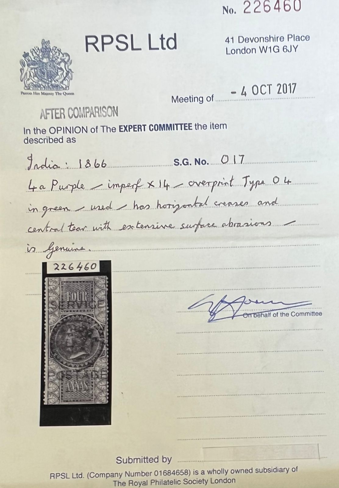 India 1866 QV SG O17 Four Annas SERVICE POSTAGE Overprint Used RPS Cert Rare SG Val £4000