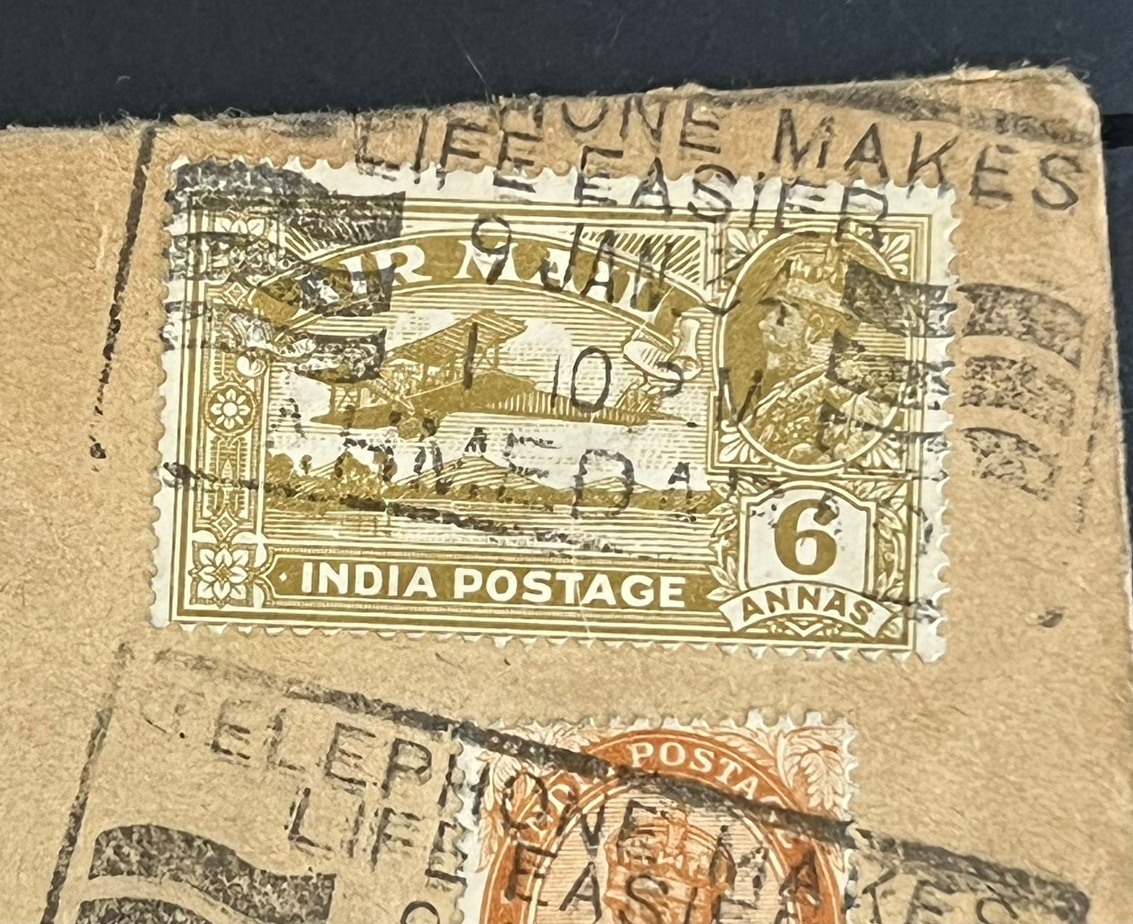 India 1929 KGV Airmail 6as SG 223a ‘Scratch through tail of aircraft’ Variety in Cover Rare
