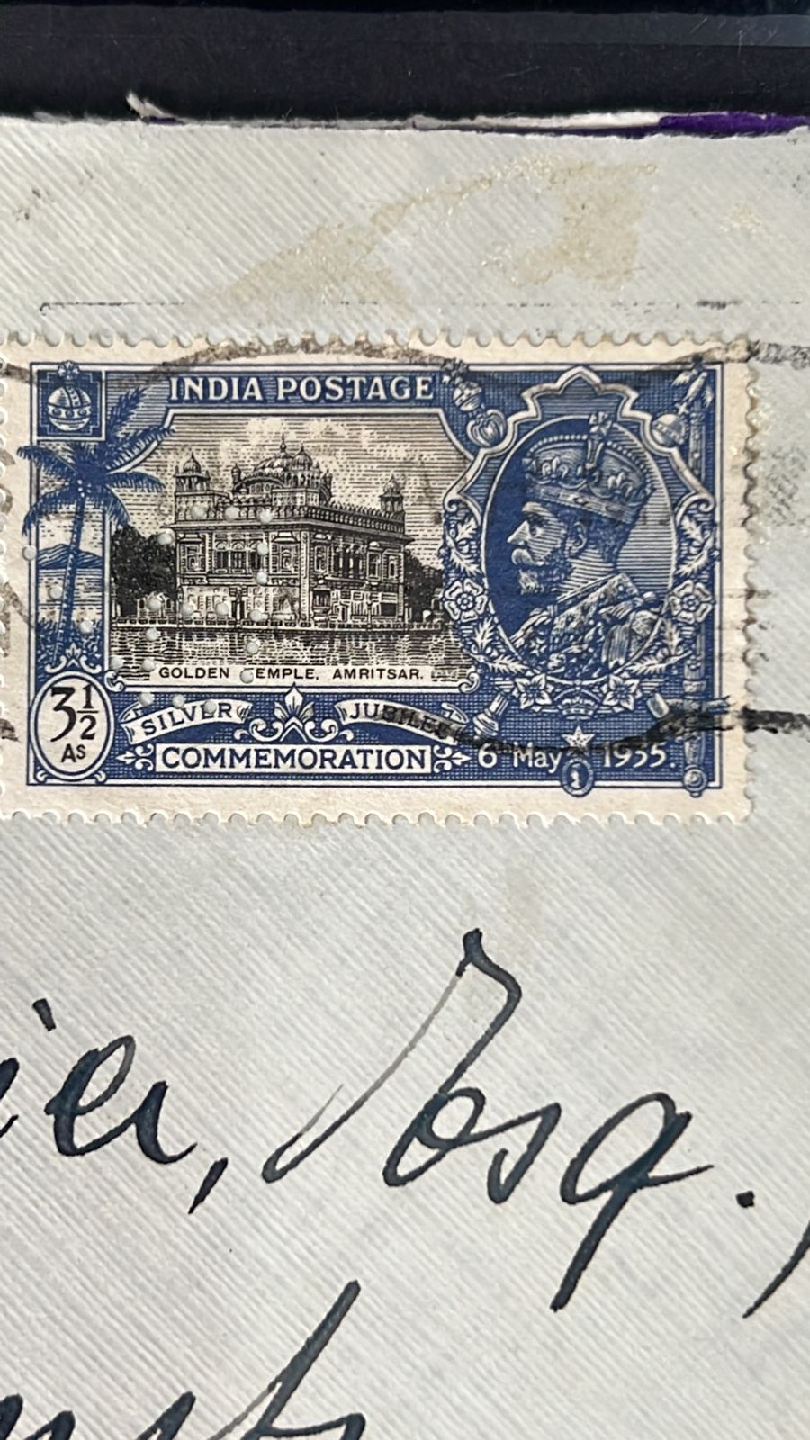 India 1935 Golden Temple Stamp with PERFIN on Cover to Switzerland , Sikhism Rare