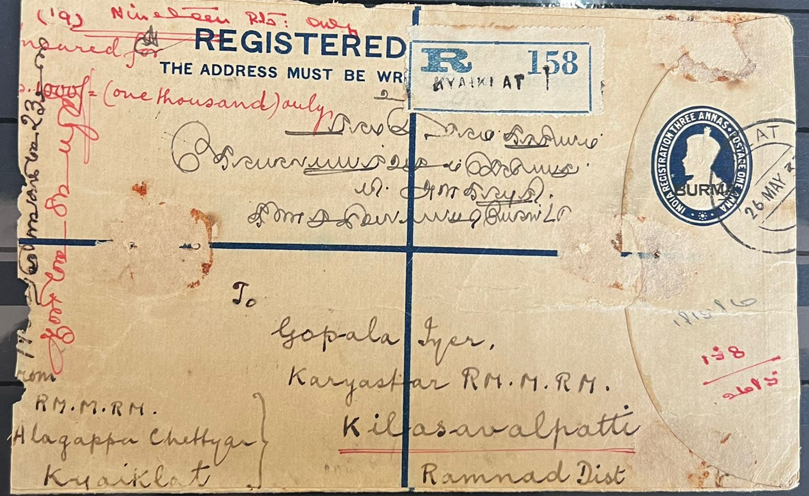 India 1937 KGV Burma Overprint Registered Envelope to Ramnad