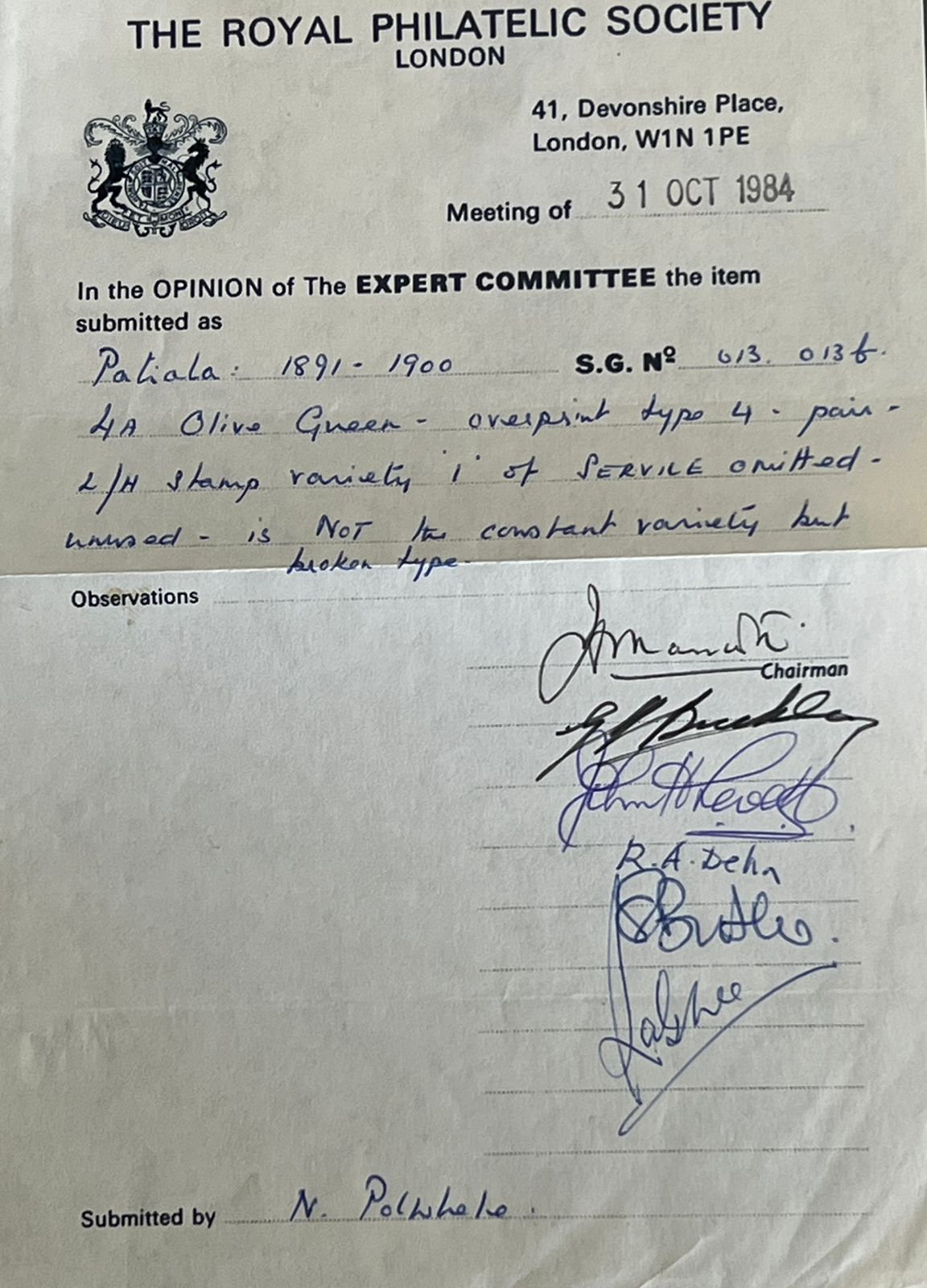 India Patiala State 1891 QV ‘I’ Missing Variety In Pair with RPS Certificate